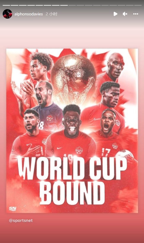 加拿大时隔36年历史第二次晋级世界杯决赛圈,阿方索-戴维斯在Instagram上晒出海报庆祝。